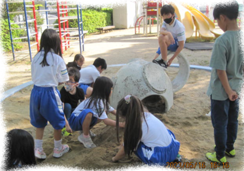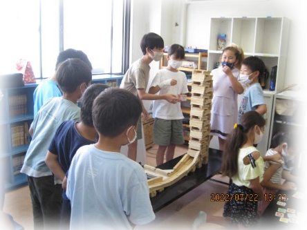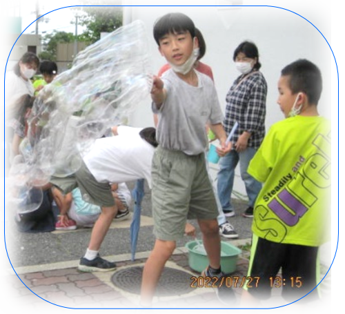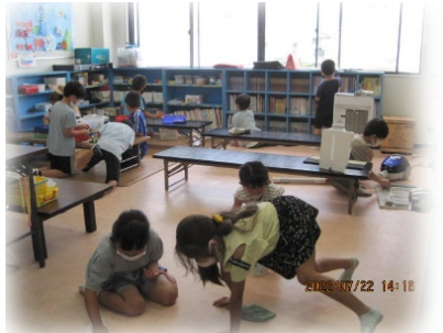 夏休みは猛暑日が続き、1日をホールで過ごしながら多様な経験を積むことができました。色々な人とかかわりながら制作活動や昔遊び等を楽しんだり、子どもたち同士でお化け屋敷ごっこ、ゲームセンター遊び等、主体的に遊びを考え進めたりしました。縦割りのグループ活動で、高学年のリーダーが低学年に優しく接している姿はとても微笑ましく、成長を感じました。